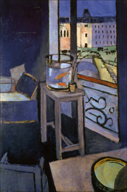 Interno con vaso di pesci rossi, olio su tela del 1914. In quest’opera il dentro “fuoriesce” e il fuori “entra”, con profonda armonia e vivacità. Com’è possibile?